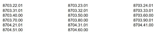 以下进口至美国的产品将会被加征25%关税:乘用车(轿车、SUV、多用途车、小型货车和货车等)和轻型卡车等,上述产品一般归入以下美国海关商品编码HTSUS: