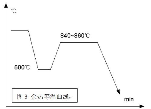 ⑵余热正火。就汽车等速传动轴内星轮锻件余热正火工艺为例。该产品材质为含碳量0.53%的碳钢,产品最终热处理为渗碳淬火,为了保证良好的切削性能,锻后要进行正火工序。该锻件产量大,生产节奏快。用于正火的能耗很高。由于正火温度较高,氧化严重,氧化皮的喷丸清理时间也比较长。我们对该产品进行了余热正火的工艺改进,锻后产品快速冷却到500℃,完成奥氏体转变,再进炉加热完成正火,如图3所示。这样,可以部分利用锻后余热,增强了生产连续性。