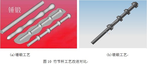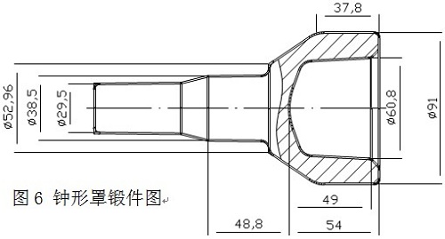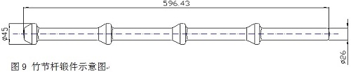 ⑷局部锻造取代整体锻造。船用锻件如图9所示。该产品原工艺用直径为35mm的材料,在2t锤稍作滚挤后整体锻造,材料利用率只有62%,不仅材料成本高,整体加热的能源消耗也大。经过多次试验,改进为细直径材料局部加热、平锻机镦粗的工艺,材料利用率从64%提升到89%,单件能源消耗也降低了50%,如图10所示。