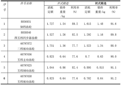 ⑵采用闭式锻造工艺。闭式锻造具有材料利用率高、锻件精度高的特点,特别适合于回转体锻件。南汽锻造通过对齿轮锻件的工艺改进,在730t摩擦压力机上用闭式方式取代原1600t锻压机开式锻造,表1是改进前后,材料利用率的对比。