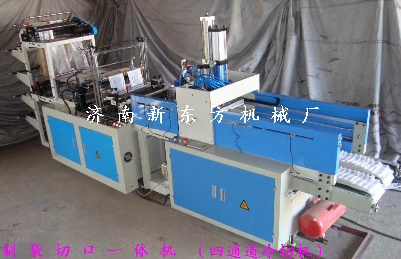 济南新东方机械厂生产的 制袋切口一体机是有光、机、气、电等一体化组成,制作方便袋的时候只需要放上膜卷 封口、计数、切口一次性完成,采用可编电脑程序控制,更节能省电,触屏调整袋子长度轻松自如,自动控制系统配合工业触控屏幕,精确设定制袋的速度、长度及数量,即可节省人力,又能提高产能及产质,使用220V照明电源主机功率1.5KW 。