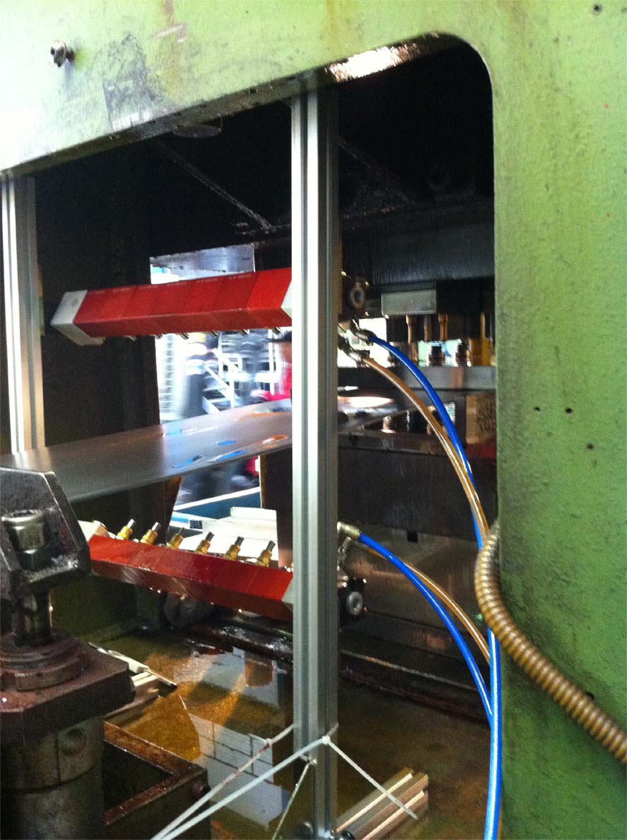 将喷头安装在进料口位置,在保证板材润滑需求的前提下,将油雾均匀、全面地覆盖在材料表面,根据喷雾大小,形成一层厚度可控的油膜。如果材料行程超过500mm,系统可以加装一个喷头在模具两侧,使其由外向内的对模具和材料进行补充润滑。将系统电磁阀与机床角度信号联动后,可以更加节约润滑油的消耗。