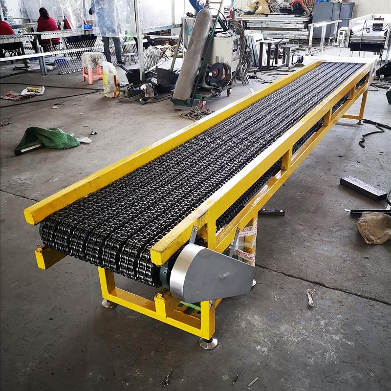 链条式输送机:是在一定的线路上连续输送物料的物料传送机械,又称连续输送机,可分为网带式和链板式,皮带式,链条式。链条式输送机可进行水平、倾斜和垂直输送,也可组成空间输送线路,输送线路一般是固定的。输送机输送能力大,运距长,还可在输送过程中同时完成若干工艺操作,所以应用十分广泛。