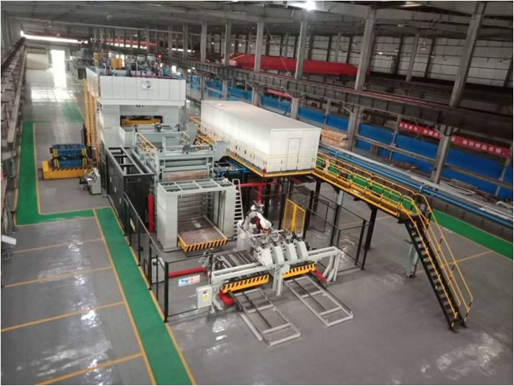 我司开发的低成本高性能世界级先进的热冲压生产线将低强度钢板基材加热至930°C、保温、进入模具压制、淬火、经热处理及成形得到高强度零件。