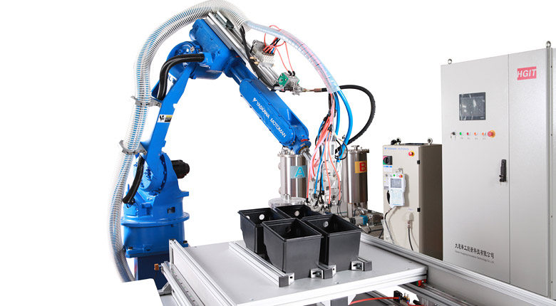 全自动密封点胶机,应用于机柜、照明、汽车、电子、滤清器、蓄电池、变频器、防爆壳体、家用电器双组份胶条点胶机为一种密封条自动成型机,其能够将双(三)组成份之原料混合浇注到设定位置或凹槽空穴处、在模具内或直接浇注在工件的平面上,通过化学反应发泡,使其从液体变为富有弹性的密封垫圈。由于其没有接头或截端,故和其他种类的密封条相比其密封性能更佳。