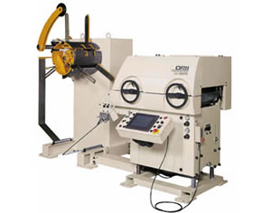 冲压机的材料供给方法,到现在为止一般为料架→整平→送料各工序使用各自不同的机器的方式。这里的整平送料机是将上述不同的机能合为一体,实现省空间的同时,配有我公司独自开发的控制模快的装置。现在它已成为冲压机材料供给方法的公认的模式。