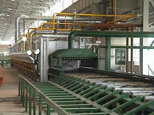 炉子有效面积: 30×1.392=41.76 m2 炉内最高温度: 1200℃ 炉料规格: Φ17~Φ426 δ=2~30mm L=4~16m 炉子小时产量: 7t/h 炉子年产量: 5万吨 炉子加热能源:天然气 燃气辊底式不锈钢管固溶连续热处理炉全长为58m,炉本体长30m,分预热段、加热段、均热段三部分。上料台12m长,下料台16m(其中4m为喷淋冷却段)。钢管通过喷淋段冷却速率大于400℃/min。并要求在通过喷淋段后钢管温度降至常温。