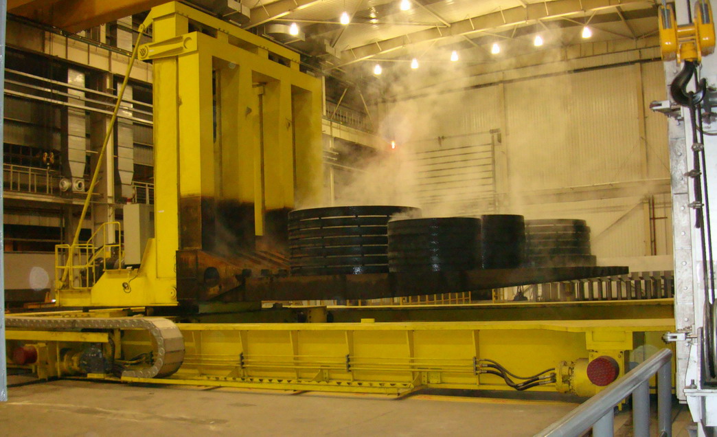 实现了同一炉批量工件一次性装炉和一次性出炉后快速放入位于大车轨道中间的淬火池进行热处理,从出炉到进入淬火池之间的时间大大缩短,产品质量和生产效率大大提高。