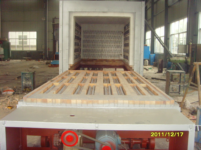 台车框架采用型钢焊接成形,其钢性保证在满负荷下不变形。内用耐火砖砌筑,易碰撞部位和承重部位用重质砖砌筑,增强炉衬结构强度,台车的行走采用自行式结构,由减速机传动链轮带动走轮在轨道上行走。台车密封采用自动迷宫式结构和软接触双密封,台车进入炉内通过凸轮及滚轮斜面作用,自动升起后进行密封。台车开出,该密封槽自动落下,密封槽内密封砂经加满后即不必经常添加。台车开出,炉门升降均为电动控制,配有电磁制动器,可防止惯性撞击炉体,并且连锁控制,即稍打开炉门后,自动切断加热元件,同时恢复台车行走机构电源。炉门关闭到位后,自动切断台车行走机构电源,同时恢复加热元件电源。为了缩短冷却工艺时间,炉顶可设有加快冷却用排气装置。该装置加热时关闭,冷却到一定温度打开、关闭打开操作由操作人员在炉子一侧通过手动机构或自动控制来完成。注:产品的最大功率及规格根据用户要求定制。