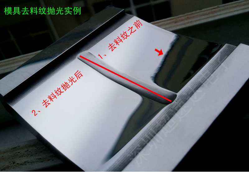 由于材料的材质和抛光方法等因素,百分之八九十的模具抛到精光的时候总是容易出现料纹,随着世界经济的不断发展和人们消费水平的不断提高,产品的档次和要求也在不断的提高,一些高端技术的产品不断的涌现出来,如液晶电视、数码产品、光学产品等,所以人们对模具表面的精度要求也越来越越高,现在模具表面讲究的不再是亮,而是要达到光学镜面、高光镜面了,因此本公司为了适应市场潮流,满足广大客户和市场新的需求,花费了一年多时间开发了新一代模具抛光产品和技术,完全可以达到高光镜面效果,一直以来最难处理的料纹麻点问题现在终于迎刃而解。