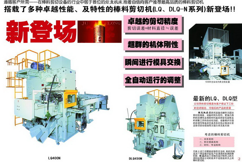 大连炬龙机床精密高效棒料切断机,切断直径从20-200毫米,切断效率20-100次/分钟,剪切表面圆度在95-97%以上,表面倾斜度在0.5至1.5度以内,加工吨位从100吨-1400吨,设备可冷、温、热剪切。