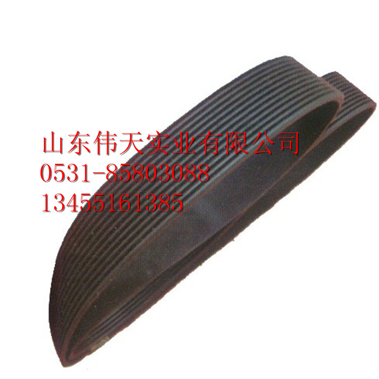 多楔带由以下主要部分组成(1)顶布顶布的作用是保护带背,防止沿带长方向产生裂纹,使整个带体保持高度的整体性。多楔带的顶布不采用经纬密度相同的帘布,而是采用经线密集、纬线稀疏的帘布。其纬线仅需具有将经线编起来的强度即可。成型时,帘布的经线与带宽方向一致,纬线与带长方向一致,这样可以大大减小多楔带弯曲时的阻力。顶布通常是由棉、维纶、涤纶等纤维混纺而成的帘布经压延擦胶而成。