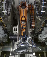 按照宝马公司的要求,把五六台伺服直接驱动的压力机连接到一起,长度约有85米。冲压成型第一步,下料机把特制的薄板放到生产线上,然后再有舒勒提供的机器人传输到下一个压力机上,压力机生产线的冲压能力可达9000吨,经过六次工艺,金属薄板(厚度为2.5mm)会被拉伸、弯曲、冲裁而形成所需的车身造型。该压力机每天可以加工600吨钢铁--相当于柏林著名的广播发射塔的重量。图为自动化横杆送料机器人把坯料从一个工作台送到下一个工作台。