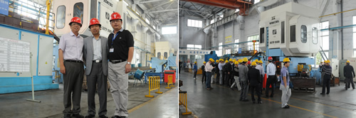 熊中平(左),韩木林(中),张宇飞(右) 南昌齿轮锻造厂此次举办的展示会,主要是演示从韩国进口的3100吨和1600吨全自动热模锻压力机生产线。该生产线是目前国内自动化程度最高的锻造生产线,由韩国镐成企业设计完成制造。 展示会上,韩国镐成企业负责人向与会人员介绍了镐成企业的基本情况、技术优势和产品的性能、特点。随后,与会人员参观了南昌齿轮锻造厂,考察了南齿锻造厂“十二五”规划和第一期技改的建设和投产情况,重点观摩了从韩国进口的3100吨和1600吨全自动热模锻压力机生产线的现场展示。这两条热模锻压力机生产线均带机械手、自动送料装置、自动模具冷却润滑装置等,实现了多工位自动锻造,由传统锻造至少8人操作减少到2人,同时避免了开式锻造夹料作业存在的各项风险。该生产线是目前国内自动化程度最高的锻造生产线,每分钟可生产锻件12-16件,达到国内先进水平。参观结束后,中国锻压协会韩木林副秘书长及与会代表对南齿锻造厂的技改工作给予了充分肯定和高度评价。