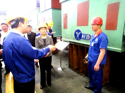 在随后的座谈会上,合锻公司党委书记、常务副总经理李安应同志汇报了企业生产经营情况,合锻公司作为国家认定企业技术中心、国家火炬计划重点高新技术企业以及我省装备制造业唯一一家连续两次承担“高档数控机床与基础制造装备”科技重大专项的企业,自主开发的工作母机及重大成套技术装备先后应用于航空航天(神舟飞船)、核电站、西气东输、大飞机制造、军工等重点工程,为中国民族工业的发展作出重要贡献。近三年,我公司荣获省部级科技奖励5项,申请专利130余项,专利授权百余项,作为液压机国家标准起草单位,合锻先后主持制修订国家行业标准23项。