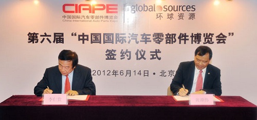 6月14日,中国国际汽车零部件博览会与全球著名B2B国际贸易平台环球资源在北京签订了战略合作协议,就第六届(2012)中国国际汽车零部件博览会的海外推广和宣传等相关事宜达成合作,旨在进一步扩大第六届中国国际汽车零部件博览会的海外知名度和影响力、增加国际客商数量。中国国际汽车零部件博览会组委会主任李仁贵与环球资源展览部总裁黄谭伟进行了现场签约。