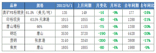 钢市传统旺季已过,淡季来临。成本继续下移,且幅度明显扩大;钢企边际利润的底限尚未被打破,因此减产意愿不足,导致供给持续高位;国家发改委加快项目审批,需求下滑速度有所放缓;5月份钢材现货市场延续上月跌势,且跌幅急剧放大。三季度之后,随着宽松政策的进一步出台,以及前期国家审批基建项目的陆续展开,钢材市场有望迎来一波反弹行情。目前钢市受政策暖风吹拂,有所好转,那么7月份主流钢厂出厂价(挂牌)该如何演绎?笔者将对此进行浅析,仅供参考。 一、成本VS盈利 1、成本 原材料市场继续弱势下行,且跌幅有所扩大。诚如笔者前文(Mysteel:对主流钢厂6月份调价政策的预判)所言,若下游需求继续疲软,钢材市场弱势依旧,则将进一步拖累原材料价格。4月份原材料领跌品种为唐山钢坯(跌幅为90元/吨),废钢较上月表现为持平;5月份废钢和钢坯双双领跌,且跌幅扩大到近200元/吨,纷创2011年7月份以来新低。 5月份以来,铁矿石价格表现为单边下跌态势,随着钢材、钢坯价格的持续下行,钢厂纷纷推迟矿石采购计划,有补库需求的钢厂也把采购价格压得很低,导致铁矿石市场成交低迷。 图表1:原材料走势对比