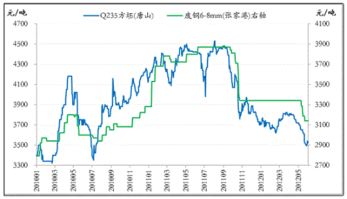 数据来源:MRI 5月份国内钢坯及废钢市场继续处于下跌通道,且价格呈加速下跌态势,市场交易量明显下降。钢坯4月份时为接近成本线,仅有部分厂家处于亏损边缘;目前钢厂大多处于亏损状态,但停产检修不多;后期形势依然严峻,厂家均反映若市场情况没有改观,将进一步安排停产检修。废钢则受累于国际钢市下滑及国际废钢持续走跌,国内钢厂全面亏损需求减少的同时压缩原料成本,内外交困导致价格加剧下行。 预计原材料市场受制于钢价反弹力度及国内外经济形势,将维持震荡态势。 图表2:方坯及废钢走势对比