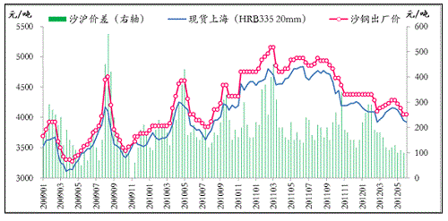 数据来源:中国海关,MRI 2、需求面 淡季来临,国家政策利好不断,后期需求有望得以改善。由于受内外部经济环境影响,4月份各下游行业增速延续此前跌势,对此近期国家各部委刺激政策频出,主要集中在交通、能源、水利等基建需求很大的领域,钢材市场也将因此受益。同时各部委日前正式下发节能产品惠民工程实施细则,大大提振市场信心。尽管步入消费淡季,然而在国家稳增长的政策下,后期下游需求有望得以改善。 三、期现价差 5月份期现价差涨跌不一,各主流钢厂6月份挂牌及执行价有稳有跌,以跌为主。就5月份期现价差来看,除镀锌、冷轧有所收窄外,热轧、中板、螺纹等其它品种均有所扩张,意味着本月市场价格若趋弱,将导致钢厂出厂价承压。 就2012年6月份各主流钢厂挂牌出厂价来看,大致可分为三种类型:1、强势平盘型。以宝钢为例,其已经维持三个月的平盘态势,除4月份给出200-500元/吨的优惠外,5、6月份仅保留了无取向硅钢200元/吨的让利,其余品种则保持平盘。2、稳中小降型。以武钢为例,6月份降幅在0-100元/吨。3、明降暗补型。以鞍钢为例,6月份各品种降幅为0-70元/吨,同时给予30-70元/吨左右的让利,以弥补前期协议户因市场倒挂产生的损失。钢厂出厂价格政策在经历4月份的高挂暗补,5月份的低挂不补,再到6月份的明降暗补之后,市场已占尽先机。 建材在历经5涨1平外加3降一平后,依旧处于下行通道。沙钢6月1日出台上旬政策,二级螺纹出厂价为4050元/吨,较上一旬价格持平,较同期上海市场现货价格高出130元/吨,价差有所扩大。虽与均值相比,仍有一定的上涨空间,然因政策利好带动螺纹钢期货率先反弹,既而刺激现货市场价格的上行,苦于并无实质性需求的强劲支撑,恐难持久。若后期市场价格冲高回落,则中旬沙钢出厂价或将仍面临降价风险。 图表5:沙钢出厂价与上海现货市场对比(元/吨)