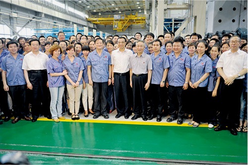 7月13日,中共中央政治局常委、国务院副总理李克强在湖北省委书记李鸿忠、省长王国生,集团公司总经理张国清,湖北省委常委、武汉市委书记阮成发,市长唐良智等的陪同下,到中国兵器工业集团武汉重型机床集团有限公司视察。 下午16时许,李克强一行首先来到武重大件加工厂。作为武重拥有自制设备最多、加工效能最高的产品配套生产单位,这里聚集了武重自主研发的XKD2755(加工长度可达57米)双龙门四铣头超重型数控镗铣床、XKC5680车铣复合加工机床、CKX双柱16米超重型数控立式铣车床等堪称世界一流、国内领先的重型装备,它们不仅成为“武重制造”生产线上的一道道亮丽的风景,也和其他设备一道组成了武重机床“永不闭幕的展览厅”。武重集团董事长、党委书记黄照向李克强介绍了武重近来年为国家重点行业和领域制造研发的关键装备。李克强充分肯定了武重集团坚持自主创新所取得的丰硕成果,他还亲自来到XKD2755双龙门四铣头超重型数控镗铣床旁,实地查看该设备的加工情况,与生产一线操作者亲切交流。当得知该设备以双龙门四铣头的设计大大提高了加工效率,且加工精度处于行业前列时,他连连点头,充分肯定了武重为提升装备制造水平、加快产业升级所做出的努力。 李克强还来到武重立车公司。该单位的产品以超大、超重、技术成熟等特点享誉海内外,也是当之无愧的中国立车第一品牌。从这里产出了一台台独一无二的极限装备,包括不久前刚刚拼装成套的目前世界上最大规格的数控立式车床——CKX53280型超重型数控立车。该设备加工直径可达28米,其机床重量达1200吨,一举刷新了由武重保持的立车制造最大规格的世界记录。李克强边走边看,所到之处受到了武重广大员工的热忱欢迎。 在考察结束时,李克强发表了重要讲话,指出:武重是全国知名企业,有着光荣的传统,是建国初期156个重点项目之一,现在又浴火重生,从老厂搬到了新厂。这里生产了很多在同行业是亚洲第一,也是世界上最大的产品。武重长了中国装备工业的志气,也支撑了中国装备制造业在关键领域的发展,而且武重产品还走向世界,在一些国家立了脚,打开了局面,把中国重型装备的王牌亮了出去。武重已经成功地进行了二次创业,要再进行第三次创业,成为世界最顶尖的企业,去创造世界一流的业绩。 |