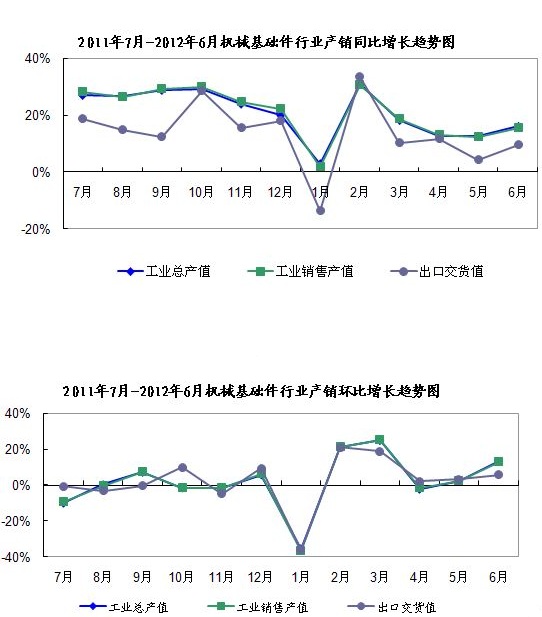 2012年6月,全国机械基础件行业产销增速同比略有上升,环比略有上升。