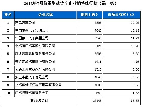 7月重型载货车企业销售排行前十