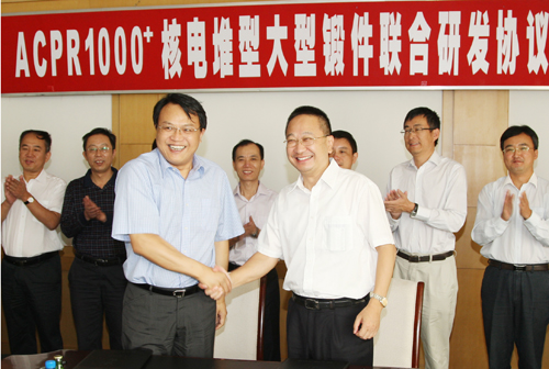 图为一重董事长吴生富与中广核工程有限公司总经理束国刚签署研发协议 为加快我国三代核电自主化建设,共同推进我国具有自主知识产权的先进百万千瓦级压水堆核电技术的研制工作,8月15日,中国第一重型机械集团公司与中广核工程有限公司在一重宾馆签署ACPR1000+核电堆型大型锻件联合研发协议。一重董事长吴生富、中广核工程有限公司总经理束国刚出席签字仪式并分别致辞。吴生富董事长与束国刚总经理在研发协议上签字。公司董事会秘书刘长韧主持签字仪式。 在签字仪式上,吴生富首先代表中国一重向多年来给予一重大力支持的中广核工程有限公司表示衷心的感谢。他说,近年来,一重在国家能源局、核安全局以及中广核工程有限公司等大力支持下,以打造世界一流的核电装备供应商为目标,在大型铸锻件的研发、技术改造等方面投入了大量的人力、物力。目前,一重核电铸锻件的制造能力已达到了世界第一的水平,产出量也位居世界前列。一重已全面掌握了“二代加”和“第三代”核电大型铸锻件制造技术,取得了压力容器、蒸发器、稳压器、主设备重型支撑等核岛设备制造资质,形成了年产5台套百万千瓦级核岛一回路主设备、10套核岛一回路设备及5套常规岛设备所需大型铸锻件的能力。日本福岛核事故后,一重进一步完善了核质保体系、技术体系和生产体系,细化了生产过程控制,实现了核电锻件质量的稳步提高,为我国核电事业发展以及新一代自主核电研制工作奠定了坚实基础。吴生富表示,促进我国核电事业的不断发展,是一重的责任。一重一定全力以赴,与中广核工程有限公司并肩携手,优质、高效地满足ACPR1000+核电堆型所需的大型锻件,共同推进我国具有自主知识产权的三代先进核电技术的研发。 束国刚在致辞中对一重长期以来给予中广核工程有限公司的支持表示感谢。他说,推进我国具有自主知识产权的三代先进核电技术ACPR1000+的研发工作,仅仅依靠中广核工程有限公司的力量是不够的。一重作为我国装备制造业的领军企业,作为我国重要的核电生产制造企业之一,通过此次合作、联合研发、优势互补,我们一定能够打造更安全、更经济、更有竞争力的三代核电技术,进而促使我国核电技术跻身国际先进前列,有力推动我国三代核电装备自主化。