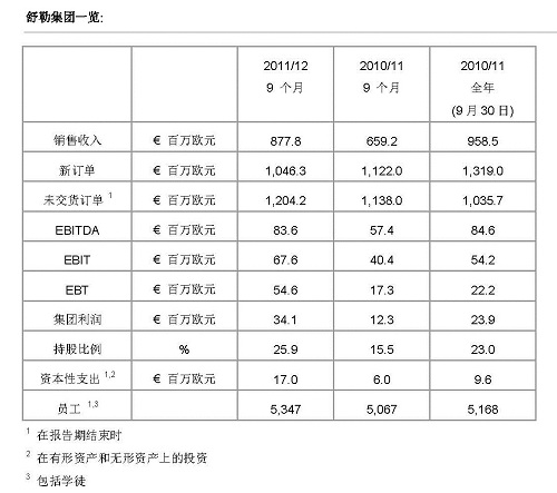 2011/12第三季度的销售收入和利润飞跃,净利润在九个月后几乎增长了两倍。 压力机制造商舒勒销售收入的强劲增长主要来自其新的机器业务,例如这种配备伺服直接驱动技术的压力机随着强劲的第三季度,舒勒集团在2011/12财政年度的前九个月成功地提高了销售收入和利润。与去年同期相比,销售收入增加了33.2%,到达了8.778亿欧元。仅仅在第三季度,舒勒的销售收入是2.97亿欧元,超过其前一年高数字的16.2%。正如在前面的季度中,亚洲和德国是集团在销售收入方面最强劲的地区。 正如预期的那样,新订单小幅下跌,因为上一年度异乎寻常的水平,制造商还在追赶推迟的投资。与去年同期前九个月相比,订单下降了6.7%。订单金额为10.463亿欧元,然而,未交货订单在2010/11年底(2011年9月30日)上升了16.3%,截止到2012年6月30日共计12.042亿欧元。 前9个月的利息、税款、折旧及摊销前调整后的利润(Ebitda)上升了45.6%,达到8360万欧元,Ebitda利润率提高到9.5%。息税前利润(Ebit)增加了67.3%,达到6760万欧元。2011年签订的银团贷款协议的条件改善使得利息得以节省,这意味着净利润的增加更为强劲。与去年1230万欧元相比,舒勒集团的综合利润几乎增加了两倍,达到3410万欧元。 “强劲的整体利润提高,不仅来自于更高的销售收入,而且也得益于我们的可持续性及利润增长的企业战略。 整个集团在过去18个月一直贯彻落实这一计划,取得了巨大成功,” 舒勒CEO-Stefan Klebert在他最新季度数字的评估中说道。 由于本集团的盈利强劲-尽管总资产增加了3.0%-持股比例从2011年9月30日的23.0%上升到25.9%。舒勒集团的净流动性略有提高,达到1.391亿欧元(2011年9月30日:1.378亿欧元)。 新的主要股东,经营策略不变 2011/12第三季度也是公司173年历史长河中的一个里程碑。在2012年五月下旬,创始家族舒勒-福伊特将其股份-总计38.5%-打包卖给了奥地利安德里茨技术集团。后者向其它股东主动提供了每股20.00欧元的收购价格。在2012年7月12日的联合声明中,董事会和监事会一致宣布:他们认为该报价在财务上是适当的,建议股东们接受这一报价。 Andritz集团以该价格收购舒勒股份的接受期在2012年8月13日结束。截至到该日期,按此报价接受了共计3,095,693舒勒股份,这相当于大约10.43%的股本。扩展的接受期从2012年8月17日开始,一直持续到2012年8月30日结束。在此期间,Andritz还获得了24.99%舒勒发行的股份。总而言之,Andrtiz目前拥有约73.93%的股份,其中从舒勒-福伊特购买了38.5%的股份,从收购行动中获得的10.43%的股份还要受反垄断机构批准的制约。公司总部设在奥地利的格拉茨,是舒勒公司的最大股东。 “我们认为Andritz对舒勒的兴趣证实了我们的经营策略,因此将继续贯彻落实这一路线,舒勒是一个非常成功的公司,我们的目标是加强我们目前的市场地位,” Klebert说道。总部设在格平根的公司已经确认了其2011/12财政年度的预测,世界上最大的压力机制造商在2011/12财政年度的综合销售收入仍有望增长到约12亿欧元。在营业利润方面,集团预期在本财政年度Ebitda利润率为9.5%左右。 舒勒预计在2011/12年新订单将达到约13亿欧元,这一数额相当于上年度创纪录的数字。鉴于全球经济风险和当前的经济下滑,目前尚不能确定在下一个财政年度是否也会如此。“一个重要的指标将是我们最重要的贸易展览会-2012年10月底在汉诺威举办的欧洲金属板材加工展。我们将展示一系列新的发展,旨在强调我们在全球市场的创新优势和领先地位,” Klebert总结道。
