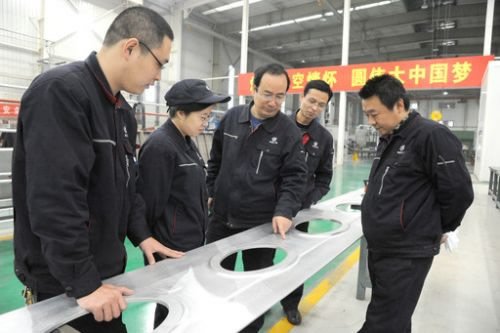 机翼制造是现代大型飞机研制的核心,机翼壁板成形是机翼制造的关键技术。面对C919飞机机翼壁板成形的难题,中航工业西飞机加总厂技术团队以数控喷丸成形技术在ARJ21飞机上的成功应用为基础,充分利用已具备的现代喷丸加工设施,进行了10多项技术攻关。截至目前,新技术已在C919飞机翼身组合体实验件中应用,壁板经过喷丸成形加工后已完成装配。图为该课题负责人和课题组成员在加工现场分析研究壁板成形技术问题。