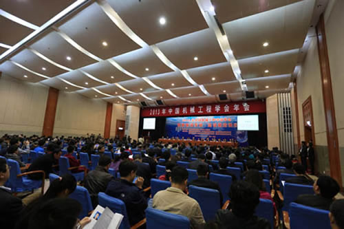 2013中国机械工程学会年会会场 本次年会由中国机械工程学会、合肥市政府联合主办,以“创新驱动发展,建设制造强国”为主题。开幕式上,与会领导分别为“中国机械工业科学技术奖”等奖项颁奖。年会上,路甬祥、周济分别作了题为《“中国制造”的未来》《实施“中国制造2020”,进入制造强国行列》的主旨报告,既分析“中国制造”的使命、全球制造的发展,又对“中国制造”的未来发展提出诸多建设性意见。全国机械领域顶级专家邵新宇、王国彪、陈学东,围绕数字化工厂、机械工程基础研究、压力容器设计制造等话题,与全国及日韩500余名专家、学者、企业家展开深入交流。
