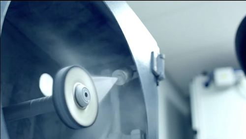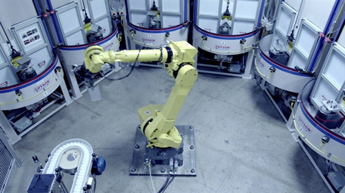 除了 Mac Pro 的机壳外,苹果还用 Guyson 自动喷砂柜来处理 Mac Pro 中心的冷却塔。而位于图片中间的是 FANUC 所生产的机械臂。