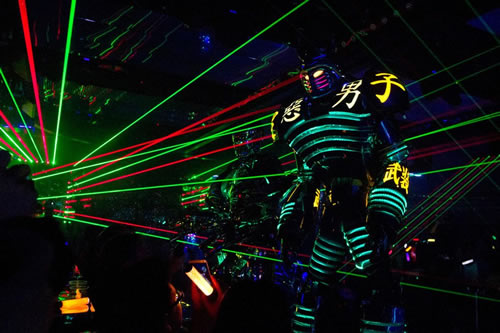 7、在这张2013年10月6日拍摄的照片中,东京机器人餐厅的激光灯照亮了表演中的机器人。