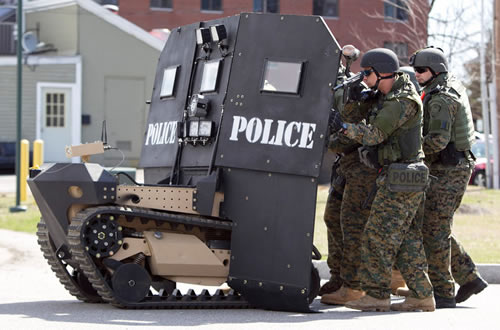 8、SWAT机器人是一种拥有护盾的远程遥控坦克型车辆。2013年4月18日,这款机器人在缅因州为媒体记者进行演示。研发公司称,他们的装置能够保证人员在面对僵局或者武装嫌犯时的安全。