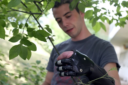 2、2013年6月3日,22岁的法国病人Florian Lopes使用他的新仿生手举着一根树枝。Lopes在2011年年末的事故中失去了三根手指,他是第一个接受这种假肢的法国病人。这款价值4.2万欧元的假肢已经在苏格兰和美国使用。