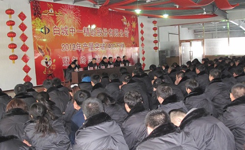 2012年,白城中一精锻股份有限公司锻件产量突破1400万件。 2月7日下午,白城中一精锻股份有限公司召开“2012年产量突破1400万件暨总结表彰大会”,全体员工汇集在公司600平米的员工活动中心,共同庆祝在过去的一年里所取得的成绩与辉煌,剖析过去的一年里存在的不足与差距,展望与规划公司未来的发展。