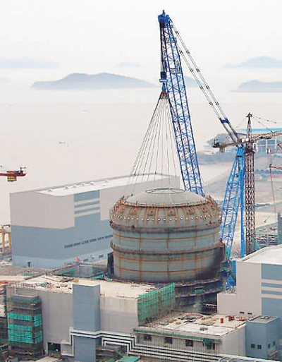 1月29日,三门核电AP1000机组钢制安全壳顶封头顺利吊装就位,至此,三门核电 1号核岛主要设备和模块已基本引入完毕,核岛施工进入全面安装阶段。 资料显示,钢制安全壳顶封头为半椭圆形封头,其筒体端直径约40米,内高11.468米,壁厚41.3毫米。顶封头外表面安装有围堰系统和空气导流板U形支架,内表面安装有消防喷淋管道等附件,安装附件后的顶封头总重量约655吨。三门核电1号机组钢制安全壳顶封头具有吊装重量重、体积大、壁厚薄、起吊半径远等特点。