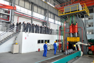 4月16日上午,河北省副省长、唐山市委书记姜德果一行考察中国二十二冶精密锻造产业基地。中国二十二冶集团董事长、党委书记李玉龙,副董事长、党委副书记魏华文,副总经理何志强陪同考察。 姜德果一行兴致勃勃地参观了精密锻造车间,观看了中国二十二冶精密锻造产业发展简介,听取了李玉龙、中国二十二冶精密锻造公司总经理冯恩庆关于精密锻造产业及项目建设情况介绍与汇报,观看了我国首条40MN多向模锻液压机生产线生产情况和产品,观看了120MN多向模锻液压机机架机器人缠绕作业情况。对全国领先、河北省首个精密锻造产业基地的建设、生产情况和发展前景给予肯定和赞许,并表示全力支持这项高技术产业,为技术创新产业服好务。 坐落于河北省唐山市高新产业园区、总占地面积420亩的中国二十二冶精密锻造产业基地以研发和生产大型多向模锻件和重型装备为主,其中大型多向模锻件主营产品为大口径高温高压阀体精密锻件;石油井口锻件;超超临界火电高温高压管道三通;重型装备主营产品为模锻液压机、自由锻液压机、等温锻液压机、板片成型液压机、挤压机等。