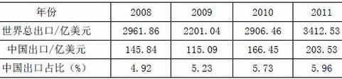 我国车轮产品出口环境 促进我国汽车零部件出口的对策与建议 如表3所示,2008~2011年,我国汽车零部件出口呈递增趋势,2011年较2010年提升22.3%,较世界平均增速17.4%,高出4.9%。年均出口金额提升10%是有可能的。我国汽车零部件出口金额占世界总出口额的比例虽然也在逐年提升,但出口的总比例还是非常低的。政府和汽车零部件企业都应该采取相关下政策和对策,以应对国际贸易保护,促进我国汽车零部的件出口。