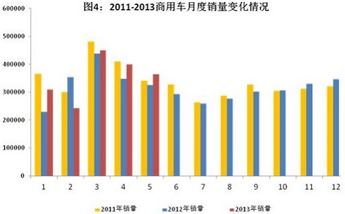 2.自主品牌乘用车销量同比增长6.8% 5月,自主品牌乘用车销售55.08万辆,同比增长6.8%,占乘用车销售市场的39.4%,较2012年同期下降0.9个百分点;其中,自主品牌轿车共销售24.95万辆,同比增长5.0%,占轿车销售总量的26.5%,较2012年同期下降0.1个百分点。 1~5月,自主品牌乘用车共销售303.54万辆,同比增长14.5%,占乘用车销售市场的41.8%,占有率同比下降0.1%;其中,自主品牌轿车共销售137.84万辆,同比增长15.5%,占轿车销售总量的28.2%,占有率同比提高0.7%。 (二)5月商用车销量同比增长12.9% 5月,商用车生产36.08万辆,同比增长20.4%,环比下降10.3%;销售36.47万辆,同比增长12.9%,环比下降8.9%。 1~5月,商用车共生产177.56万辆,同比增长7.1%;销售176.65万辆,同比增长4.5%。