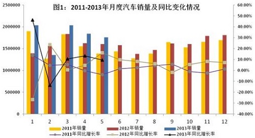 2013年5月,我国汽车产销环比有所回落,但同比呈现明显增长。1~5月汽车累计产销仍保持较高增长速度。