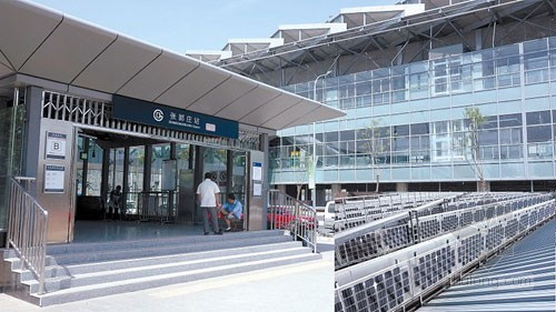 北京地铁14号线张郭庄站 在北京地铁14号线张郭庄站,一块醒目的电子节能展示牌显示着光伏发电节能数据。该站因是国内建成运营的首座屋顶太阳能光伏发电地铁站而受到关注。 负责承建这个站的是中铁十四局集团电气化公司。据该公司介绍,这里装机容量为60千瓦的太阳能光伏发电系统运行正常,日均发电量40至50千瓦,承担了地铁张郭庄站大约1/3的日用电量。 北京地铁14号线是北京市轨道交通线网中一条连接东北、西南方向的轨道交通“L”型骨干线,其中西端两站即园博园站和张郭庄站为地面高架站。张郭庄站为14号线西段终点站,站体屋面由美国设计师设计,为有效减少夏季屋顶的热能吸收而又不影响冬季的有效采光,最终确定采用双曲面格栅型钢结构屋面。 建设单位北京市轨道交通建设管理有限公司为最大限度的节能减排,决定在张郭庄站屋顶的采光立面设置太阳能光伏发电系统。按照北京地区平均太阳光照射角度计算及平均照射量,需要2500平方米电池组件采光发电,为使屋顶采光面达到50%自然透光率的设计要求,在建设中采用了半透光型太阳能电池组件排布,改变了太阳能组件上多晶硅电池片密集结合的传统方式。 安装施工中,建设单位、设计单位、监理单位及施工单位密切配合展开科研攻关。施工单位中铁十四局集团电气化工程有限公司克服了时间紧,任务重,没有经验可借鉴等诸多困难,保质保量的在14号线西段正式运营前,完成了全部设备材料安装,达到了调试条件。 具有太阳能光伏发电系统的北京地铁14号线张郭庄站的建成通车,业内专家认为,地铁站采用光伏发电在全国具有节能减排的示范意义。 |