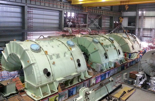 6月30日,哈汽公司为中核集团三门核电站制造的世界首台AP1000三代百万核电汽轮机的高压缸上半缸吊装就位,标志着世界首台AP1000核电汽轮机高压缸扣缸完成,至此,三门核电1#机组汽轮机高、低压缸全部顺利扣缸。