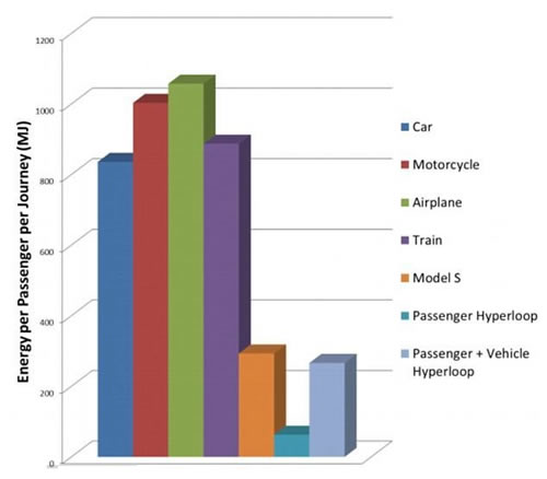 各种交通工具完成旧金山到洛杉矶之旅需要花费的能源成本 超级环路列车的优点在于速度快,成本低,不受天气的干扰,每个乘员舱中都有紧急制动系统,在发生情况时可提供氧气供应,是非常节约能源的交通模式。图中显示了各种交通工具完成旧金山到洛杉矶之旅需要花费的能源成本,其中飞机最高,超级环路列车最低。