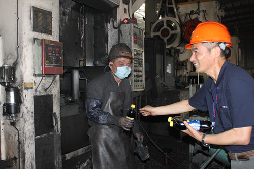 持续高温,江苏龙城精锻有限公司领导高度重视一线员工的防暑降温工作。今年也不例外,龙城精锻总经理庄建兴、副总经理王玲、生产副总徐进、质量副总汤晓锋、工会主席时晓东等领导组建了高温慰问团,带着公司董事长的关怀来到生产一线进行高温慰问,给一线员工极大的精神鼓舞。 龙城精锻一向重视一线员工的生产、生活条件,公司董事长多次强调,要杜绝各种安全隐患,确保一线员工的生命安全。为此,高温慰问团特意给高温下坚守岗位的一线员工递上一瓶可乐,送去一份清凉,向他们道一声“你们辛苦了!”感谢他们为龙城所付出的辛劳,并嘱咐他们注意身体、注意安全。同时听取了一线员工的需求,为本年度高温期间的安全提供了保障。