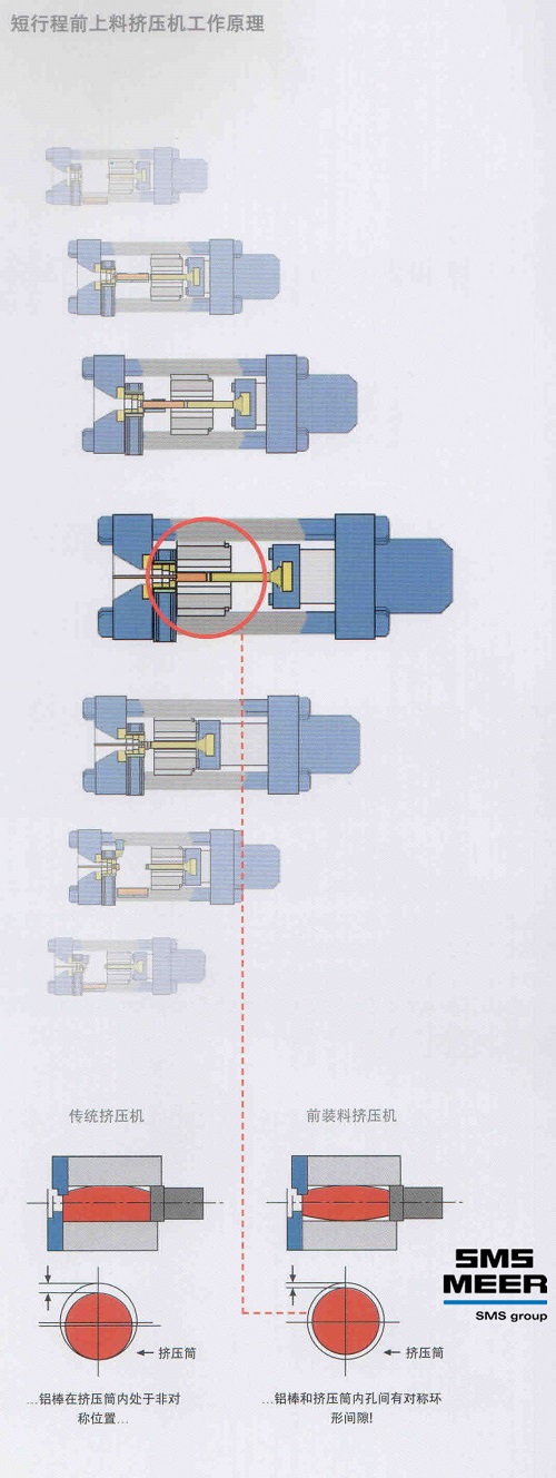 西马克梅尔的施罗曼轻金属挤压机现在的典型产品是短行程前上料挤压机。其特有的前上料技术由西马克梅尔开发研制,已经在世界范围内得到客户的确认和青睐。目前,西马克梅尔公司可以提供从10MN最大到160MN的不同规格的轻金属挤压机。
