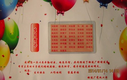 新年伊始,一拖锻造厂不仅给每位元月份过生日的员工奉上一份由党政工团联合签名的生日贺卡,而且通过内部网站、广为张贴等形式将“生日祝贺”在全厂范围内发布,让更多的人为这些“寿星”送去衷心的祝福,使他们在寒冷的腊月感觉到了浓浓的暖意。