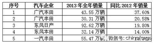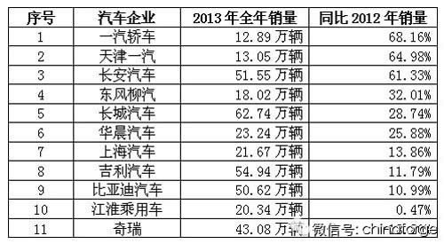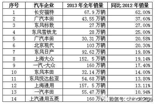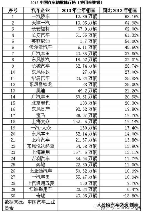 在刚刚过去2013年,中国汽车市场整体增长依然十分强劲。据中国汽车工业协会统计分析,中国全年汽车产销跨上2000万辆台阶,全国汽车产销2211.68 万辆和2198.41 万辆,比上年分别增长14.8%和13.9%,比上年分别提高10.2和9.6个百分点,增速大幅提升,高于年初预计。产销突破2000万辆创历史新高,再次刷新全球记录,已连续五年蝉联全球第一。 以上数据表明,2013年的中国车市可谓全线飘红,细分到各个企业,就是增长比例不同,大部分车企同比2012年销量都达到了两位数的高速增长,尤其是日系车,得到了全面的复苏,只有个别自主品牌,出现了一定的下滑。 从上面的统计表可以看到,在国产车中一汽轿车增速最为迅猛,虽然总台数仅有12.89万辆,但同比2012年销量增幅达68.16%。而进口车中,英菲尼迪在2013年表现抢眼,销售1.7万辆同比增幅达54%。在合资车企中长安福特销售67.9万辆,同比2012年增幅62%。而销量最高的上汽通用五菱去年完成160万辆,同比增长9.76%。而日系车企中,广汽本田依旧表现抢眼,去年销售43.55万辆,同比增长37.6%,而兄弟企业广汽丰田增长也不错,2013年销售30.31万辆,同比2012增长20.58%。 1、合资车企 长安福特2013年大爆发