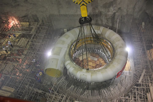 图为仙居抽水蓄能电站2014年6月9日吊装的首台机组座环、蜗壳 11月4日10时,由中国电建集团所属水电五局承建的国内抽水蓄能电站最大单机容量——浙江仙居抽水蓄能电站3号机组座环、蜗壳吊装成功。 仙居抽水蓄能电站是国家“十一五”重点建设工程,也是国内抽水蓄能电站单机容量最大的电站项目(单机37.5万千瓦)。建成后将承担华东电网调峰、调频、调相及紧急事故备用任务,为华东电网提供约300万千瓦的调峰容量,有效增强其调峰、填谷能力。电站投产后,每年可为浙江电网节约标煤约9.87万吨。减排二氧化碳约26万吨、二氧化硫0.24万吨。电站若按50年运行考虑,可节约标煤约493.5万吨。 水电五局承建的该电站工程的地下厂房、4台机组及金属结构安装任务。该电站共安装4台37.5万千瓦混流可逆式水轮发电机组,总装机容量为150万千瓦。 |