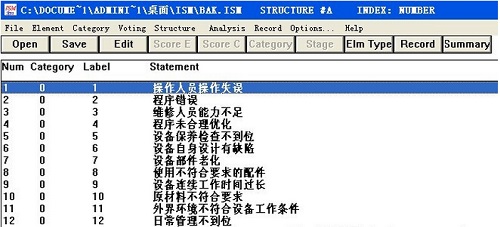 前因集:可以到达要素Si的要素集合定义为要素Si的前因集,用A(Si)表示,由可达矩阵中第Si列中的所有矩阵要素为1的行所对应的要素组成。 最高级要素集:一个多级递阶结构的最高要素集,是指除了可以到达自己本身外,不能到达其它要素的要素组成的集合。其可达集R(Si)中只包含它本身的要素集,而前因集中,除包含要素Si本身外,还包括可以到达它的下一级要素。 若R(Si)=R(Si) HA(Si)这里i=j,则R(Si)即为最高级要素集。 找出最高级要素集后,即可将其从可达矩阵中划去相应的行和列,接着,再从剩下的可达矩阵中继续寻找新的最高级要素。以此类推,可以找出各级所包含的最高要素集。 2)通过ISM模拟软件建立可达矩阵,如图1所示。