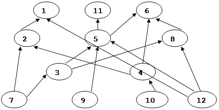 4)各层级分布。 第一层要素集合为{(7) (9) (10) (12)},第二层要素集合为{(3) (4)},第三层要素集合为{(2) (5) (8)},第四层要素集合为{(1) (11) (6)}。 5)结构模型图,如图3所示。
